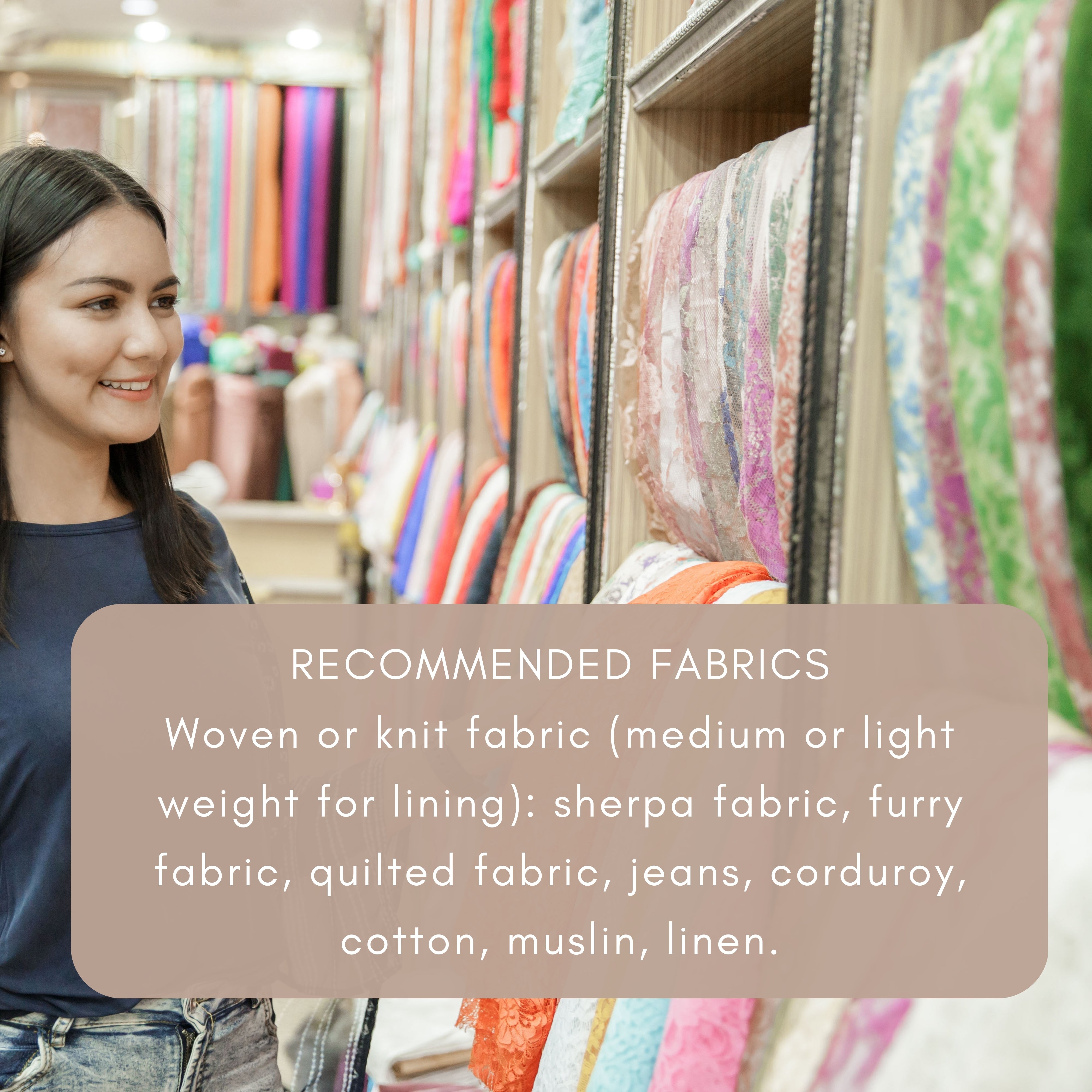 Woven or knit fabric (medium or light weight for lining): sherpa fabric, furry fabric, quilted fabric, jeans, corduroy, cotton, muslin, linen.